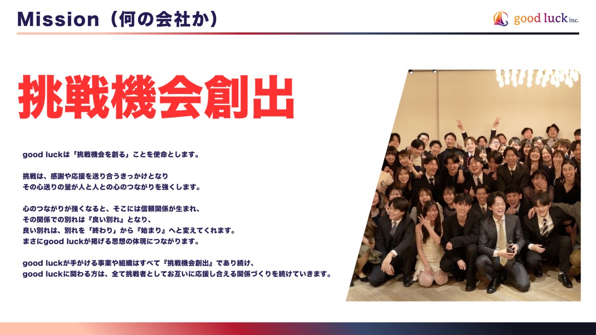 Purpose「Always Be Goodluck」を軸に、Mission「挑戦機会創出」、